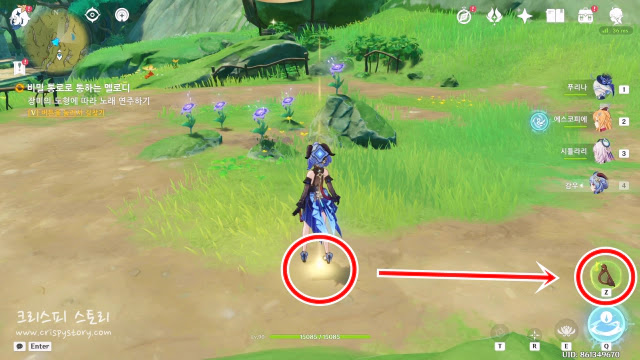 풀 씨앗을 찾으려면 일단 아래쪽으로 내려가 스샷 위치에서 하프를 연주하고 다시 다른 장소로 넘어가야 한다.